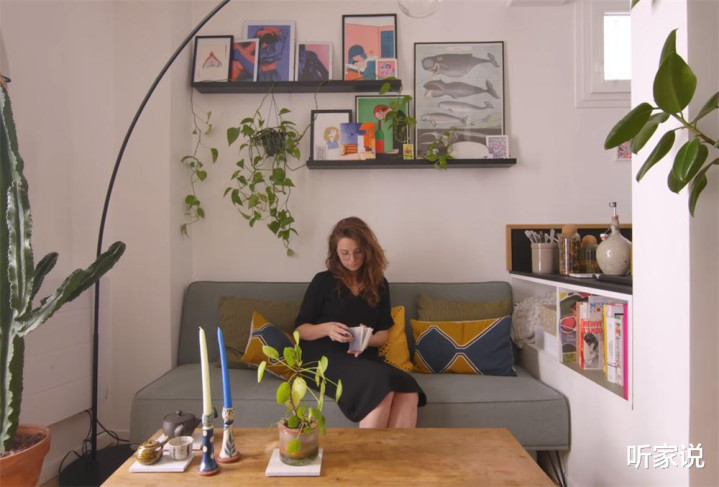 如今对于很多家庭来说,电视已经并非是必需品了,茱莉娅的家便是如此——沙发对面并没有去布置电视墙,而是放上一组矮柜来收纳杯盏碗碟,顶部则当做一个放装饰品和音响的地方,小角落看起来颇有文艺范儿。