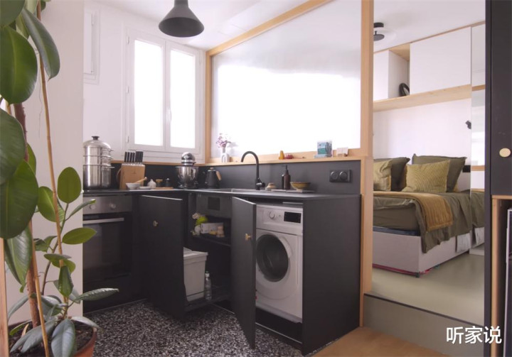 在没有吊柜的情况下,这底部橱柜收纳下了厨房里的大部分餐具厨具和调味品,更是嵌入了洗衣机和烤箱,可以说是在极限的面积下,尽可能满足了日常烹饪用餐需求。