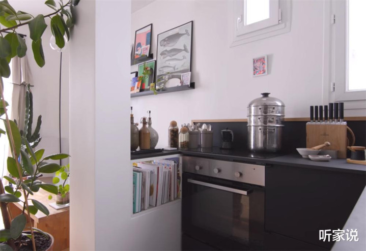与很多类似的极小户型公寓相同,灶台都不允许使用明火,转而用电磁炉灶台代替,旁边则是与客厅隔断的承重柱和矮墙,中间镂空当书架,上面放油盐等调味瓶,看起来乱中有序。
