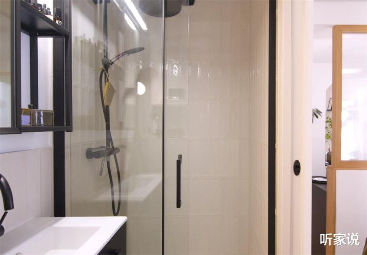 浴室还特意做了一扇玻璃门进行隔断,洗澡时候能防止水花溅射导致的卫生间受潮发霉,唯一的麻烦就是高透玻璃需要每次洗完澡后都刮干净才行,否则会留下水渍。
