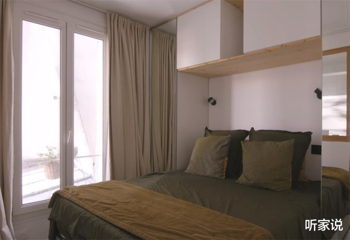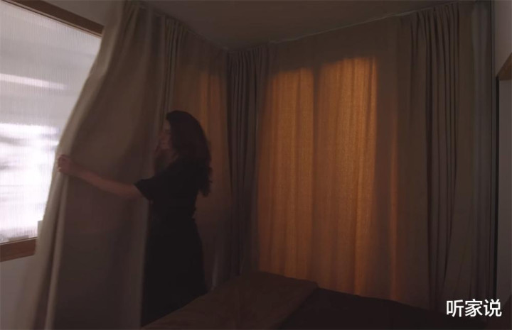 卧室没有房门,但却有其他的方法进行隔断和遮挡,那便是——用一条超宽的窗帘代替。