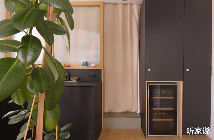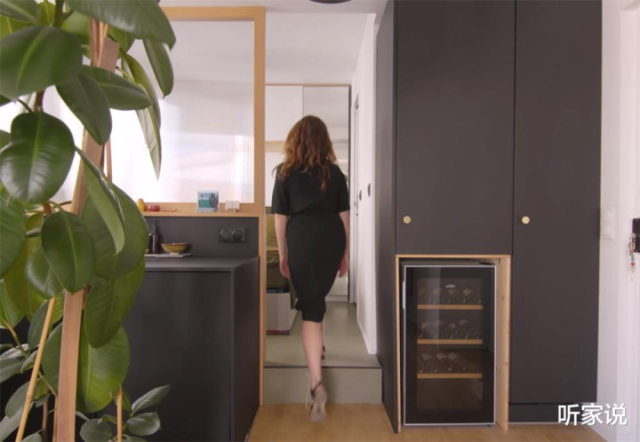 还记得进门玄关处的黑色柜子吗?它实际上嵌入了一台小冰箱、一台酒柜和一个分层的零食柜,柜门关上时,这些零散杂物都隐藏其中,既与厨房空间相呼应,又避免了让室内看起来显得杂乱。