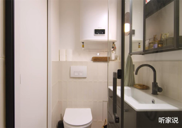 一进门正对洗手池,用悬空柜+镜柜的布置,收纳下各种卫浴杂物,同时又方便清洁打理;而马桶横向摆放,留出角落里一个放拖把扫把和安装热水器的空间,2㎡不到的小卫生间,塞得满满当当。