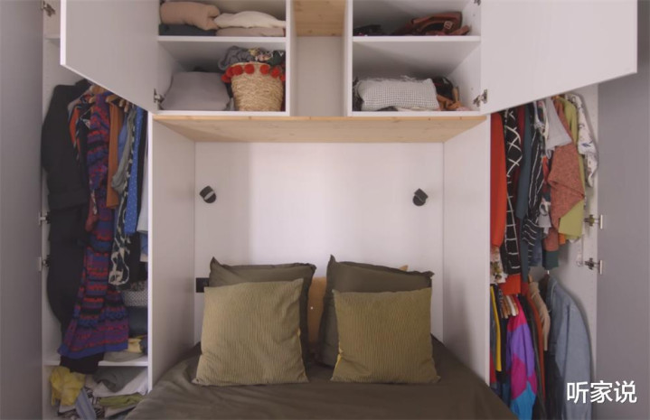 实际上茱莉娅的衣服很多,但卧室面积却不足以装整组衣柜,只好将每一寸冗余空间都尽可能利用起来。