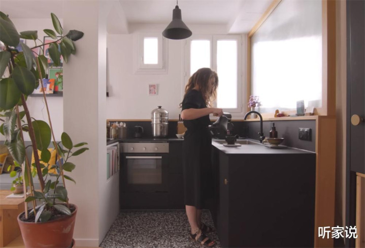 【厨房设有子母窗,做黑色调也不压抑】