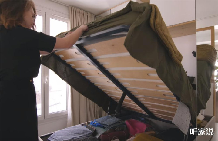 双人床本身也是箱体式的,用液压撑杆进行开关,省力又方便,床底空间主要用来收纳换季后的大件衣物和被褥,时常进行断舍离,倒是也能塞下她平时穿的各种衣物。