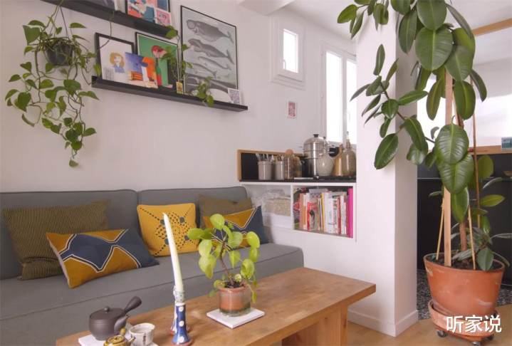 客厅周围更是被绿植环绕,从大株的橡皮树、龟背竹,到小盆的绿萝,都让这蜗居更显生机活力。